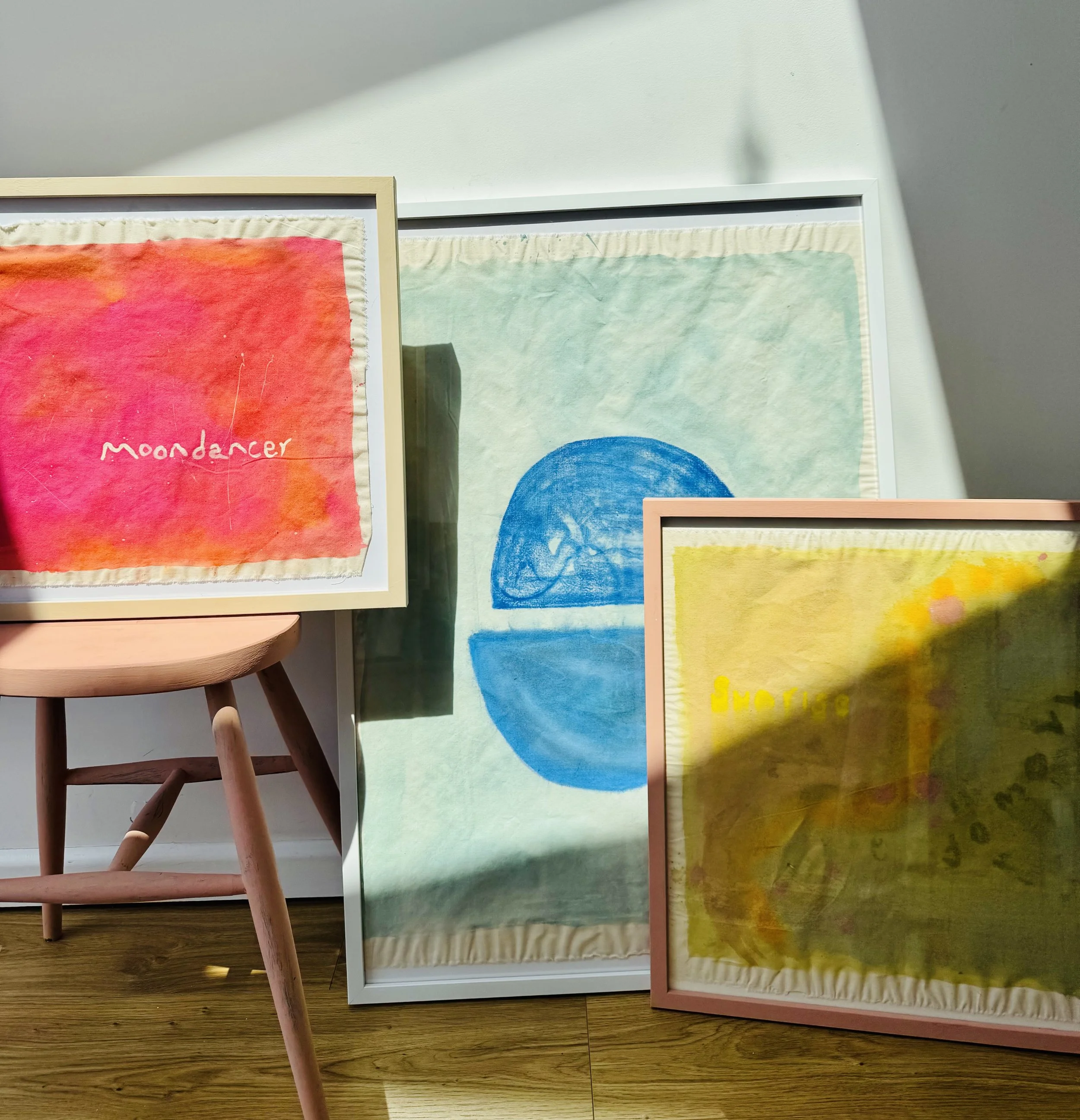 Framed abstract paintings with bright colors leaning against a white wall, next to a pink wooden chair on a wooden floor. One painting has the word "Moondancer" written on it.